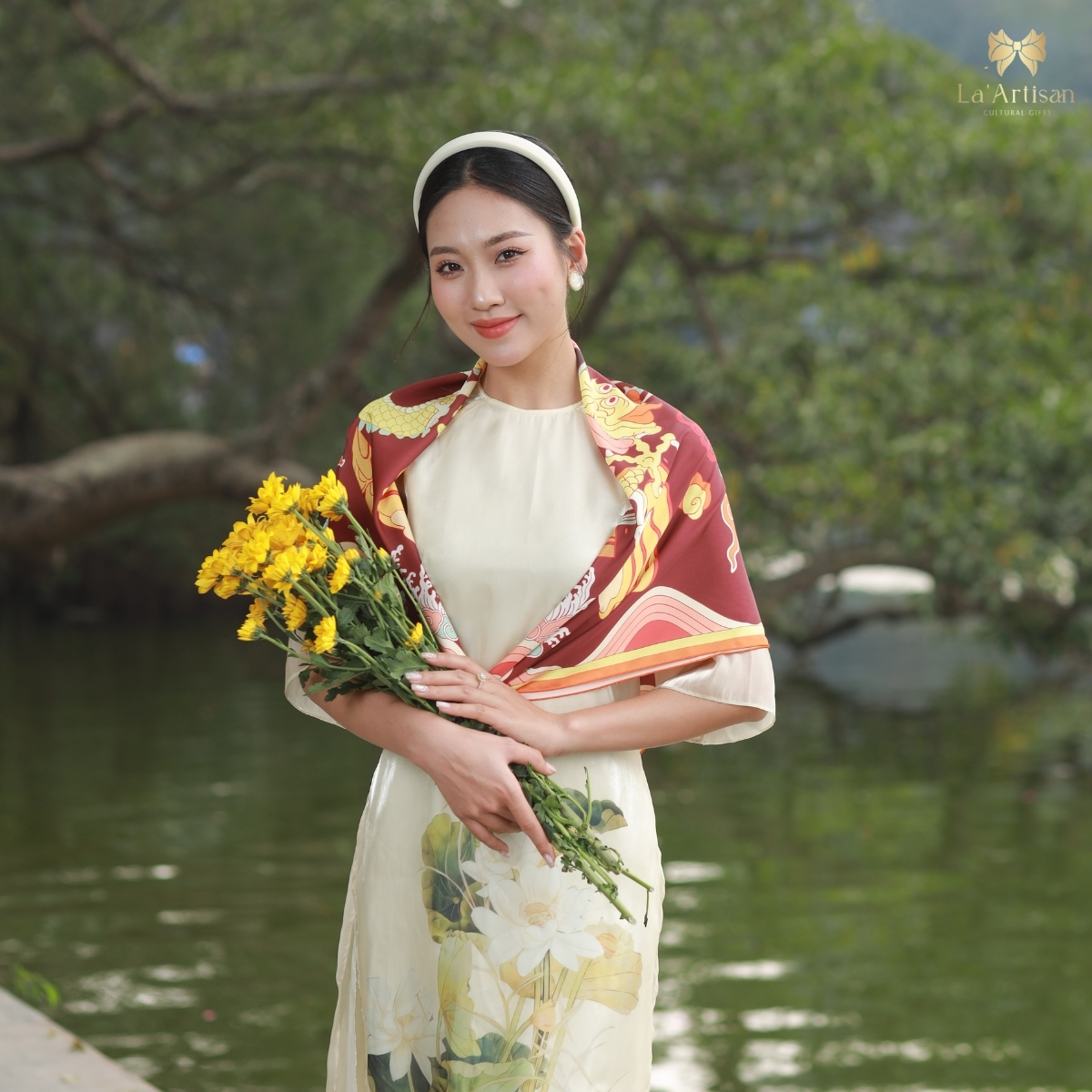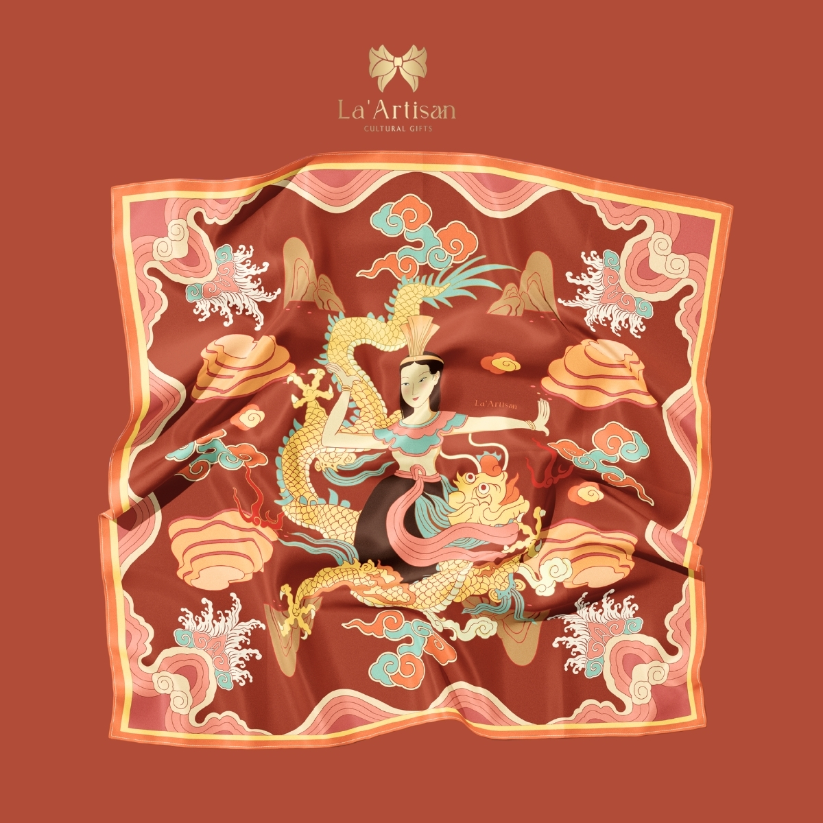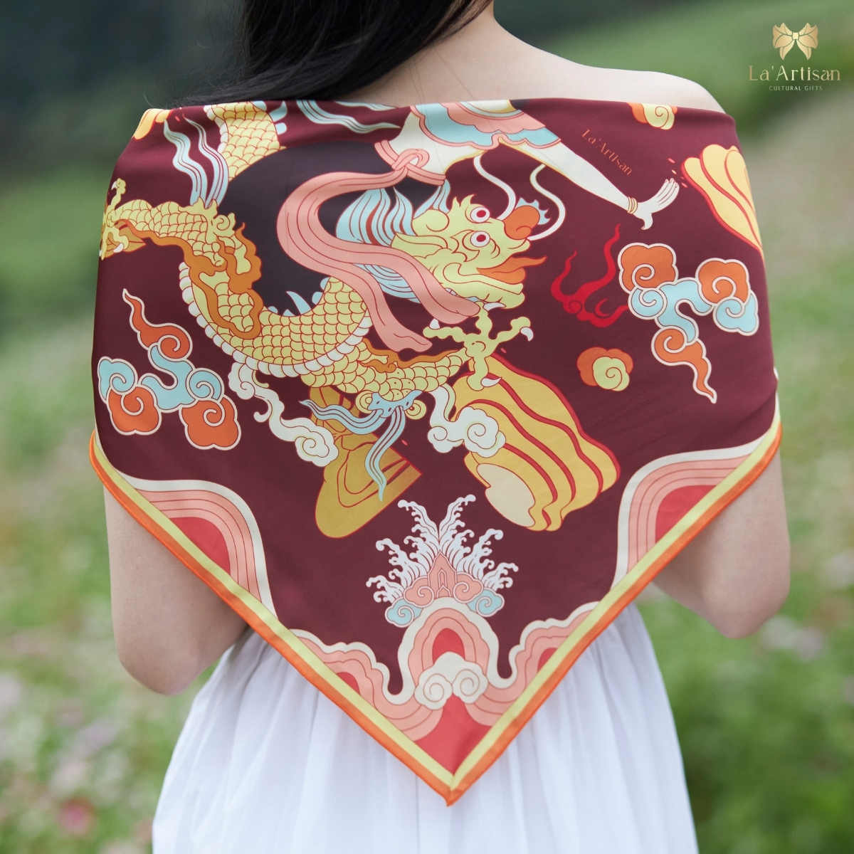 Tựa như một bản sử thi, thiết kế khăn hoạ tiết Mẹ Âu Cơ của La’Artisan gợi nhắc về khởi nguyên dân tộc Việt qua huyền thoại “Con Rồng Cháu Tiên”. Lấy cảm hứng từ hình ảnh Quốc Mẫu Âu Cơ - người mẹ đầu tiên đã dừng chân tại vùng Hiền Lương trù phú, dạy dân trồng lúa, dệt vải, nuôi tằm.